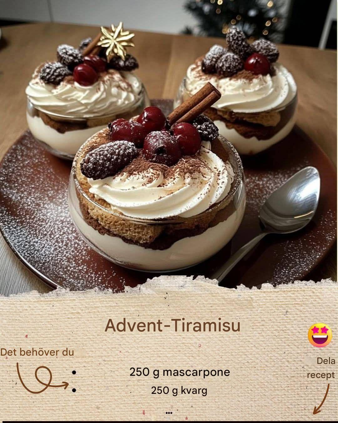 Under advent fanns denna dessert på nästan varje familjebord. Mormor dukade kärleksfullt upp den medan vi barn väntade spänt. Doften av kanel och kakao, den krämiga fyllningen – varje glas var en liten bit julmagi. Denna tiramisu tar tillbaka magin från gångna jular till bordet – krämig, aromatisk och full av minnen. ✨
