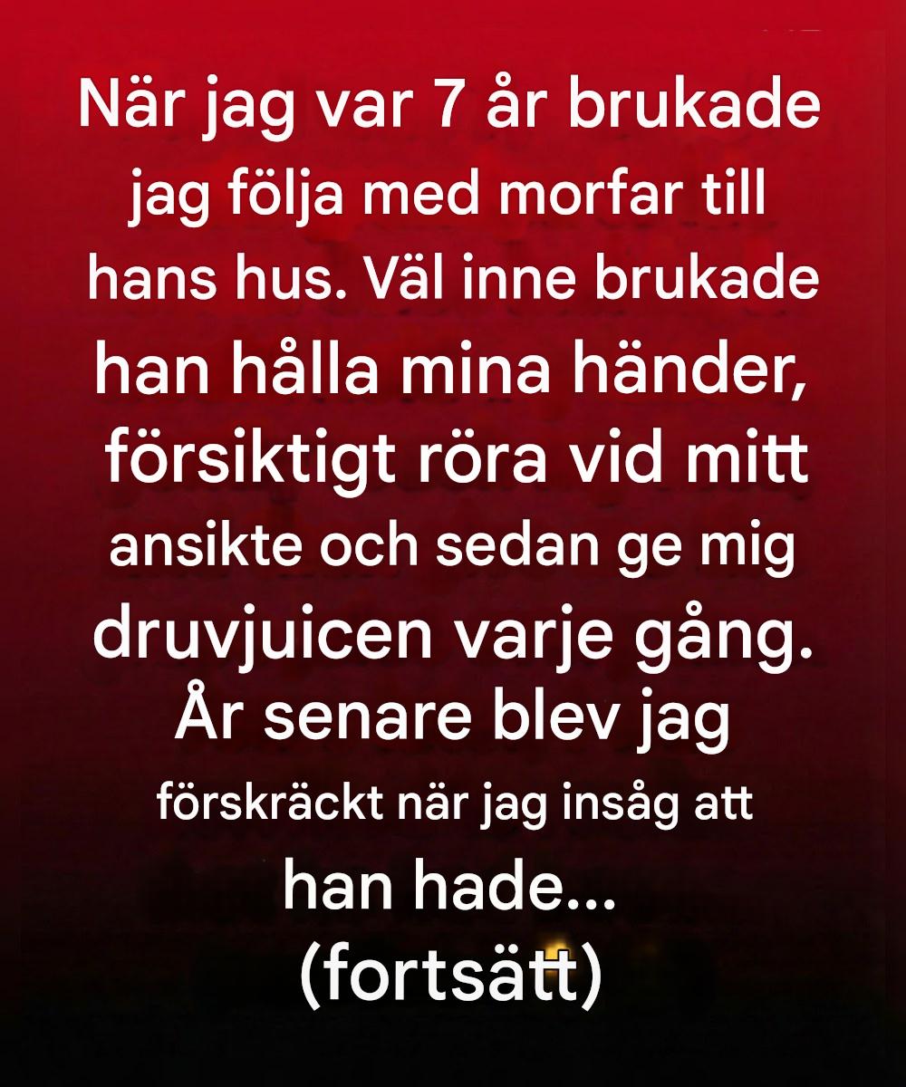 Det kändes viktigt, även om jag inte kunde ha förklarat varför. Jag brukade gå bredvid honom från hörnbutiken till hans lilla hus längst bort i kvarteret, med min hand tryggt omsluten av hans, som om det var jag som såg till att vi kom fram säkert. Väl inne utspelade sig allt på samma sätt varje gång. Han höll mina händer, tittade uppmärksamt på mitt ansikte och log mjukt innan han hällde upp två glas druvjuice. Han talade sällan, men sättet han fokuserade på mig fick rummet att kännas lugnt och skyddat. För mig var det inget annat än vår privata vana, en mild paus i en annars vanlig barndom.