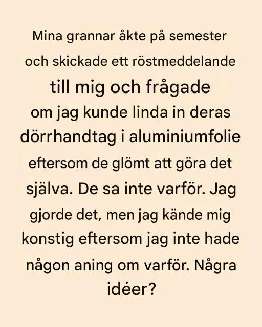 Jag gick dit för att göra det, i en önskan att vara en hjälpsam granne, men jag ska erkänna att jag kände mig lite konstig hela tiden. Jag undrade hela tiden: varför skulle någon behöva linda in ett dörrhandtag i glänsande aluminium? Det kändes som en scen direkt ur en deckarfilm – eller ett av de där virala "livsknep" på sociala medier som kanske fungerar eller inte fungerar. Nyfiken bestämde jag mig för att gräva lite för att ta reda på varför folk faktiskt gör så här.