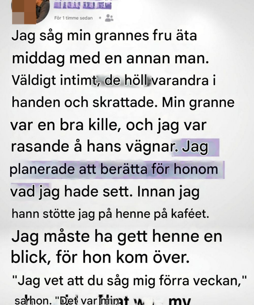 Kvällen hade varit oansenlig – mjuk musik, varma lampor, tallrikarnas mjuka rytm – tills jag lade märke till Sarah, min grannes fru, sittande i ett hörnbås med en annan man. De lutade sig nära, skrattade lätt, deras avslappnade uttryck antydde förtrogenhet och tillit. På några sekunder fyllde mitt sinne en hel berättelse.