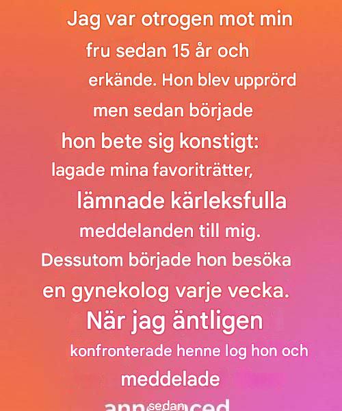 Sedan lade jag märke till något annat. Varje vecka, utan undantag, besökte hon sin gynekolog. Samma dag. Samma tid. Hon sa att det var rutin. När jag erbjöd mig att köra henne tackade hon nej.