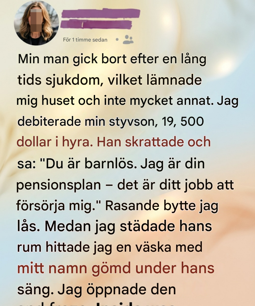 Rummen var desamma, men allt lät tomt, som om väggarna själva höll andan. I månaderna före hans bortgång hade våra dagar konsumerats av sjukhuskorridorer, laboratorieresultat och försiktig optimism. När allt detta tog slut kändes tystnaden som följde tyngre än den rädsla vi hade levt med tidigare. Vid sidan av sorgen kom en våg av praktiska bekymmer – utestående sjukvårdskostnader, bolånebetalningar och den skrämmande verkligheten att klara allt ensam. Min nittonårige styvson, Leo, bodde fortfarande hos mig. Vi sörjde båda, men vi kämpade också på olika sätt och försökte föreställa oss en framtid som ingen av oss hade förberett oss för.