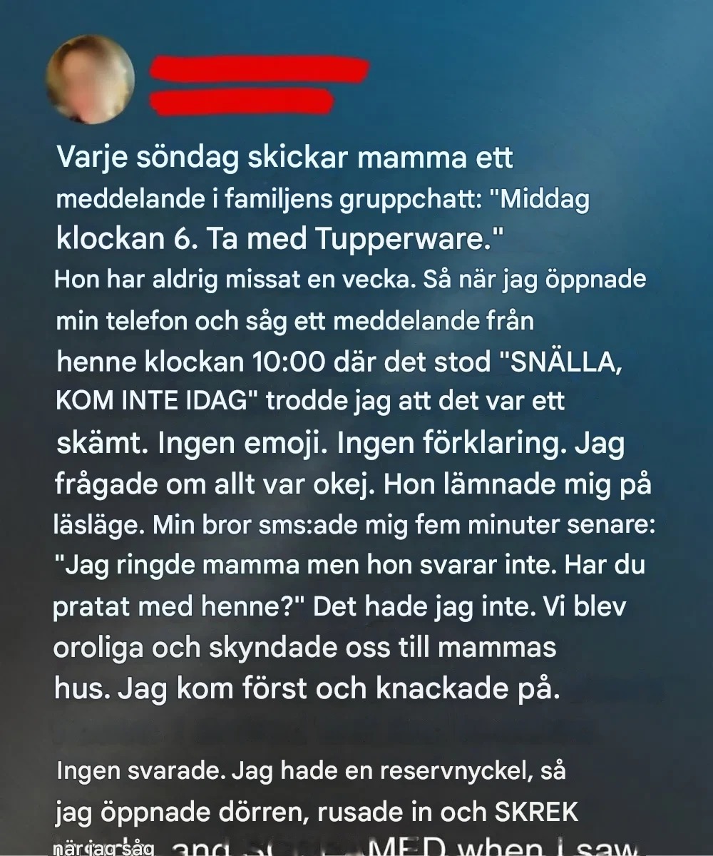Så när hon skickade ett kort sms en söndagseftermiddag som helt enkelt sa: "Snälla, kom inte idag", sjönk mitt hjärta. Ingen förklaring. Inget leende ansikte. Bara fem oroande ord. Min bror och jag utbytte en blick och visste direkt att något var fel. Vi ignorerade meddelandet, satte oss i bilen och körde rakt till hennes hus, med ångest som spände sig i bröstet.