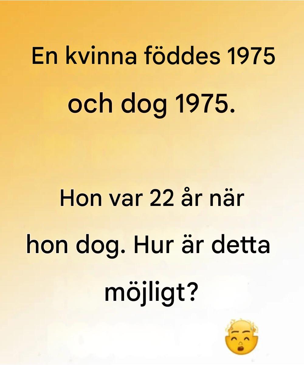 En gåta har blivit viral online, dragit till sig stor uppmärksamhet och lämnat otaliga användare förvirrade. Bilden presenterar ett till synes omöjligt scenario: "En kvinna föddes 1975 och dog 1975. Hon var 22 år gammal när hon dog. Hur kan detta vara möjligt?" Uttalandet väckte snabbt diskussion och spekulationer på sociala medier.