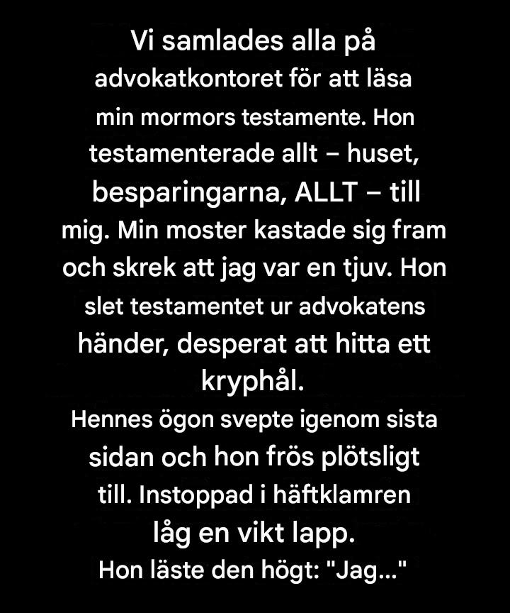 Huset luktade citronkräm och lavendel – precis som mormor alltid hade det. Jag satt i hennes favoritfåtölj med kuvertet tungt i mina händer.