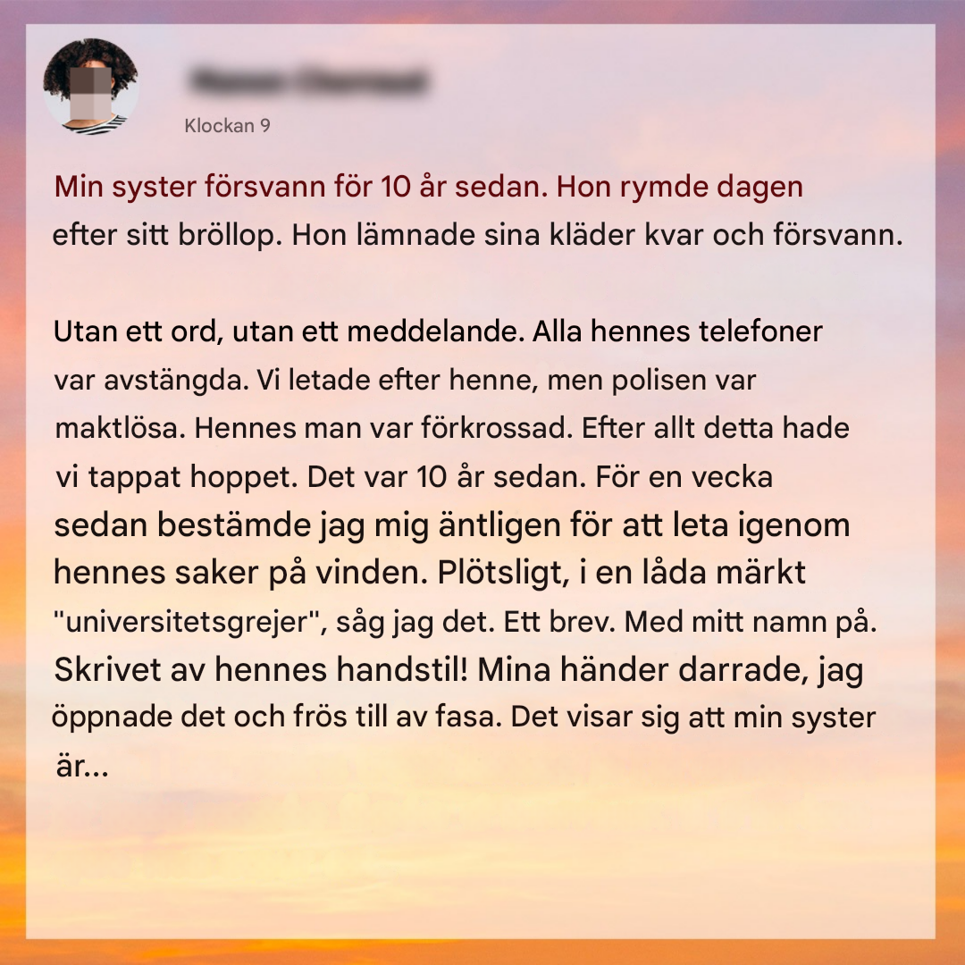 Sökandet började, drivet av brådska och hopp. Sedan förvandlades veckor till månader, och månader till år. Myndigheterna hittade ingenting. Inte vi heller. Lite i taget försvann tanken på att någonsin få se henne igen, ersatt av en dov, konstant smärta.