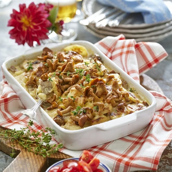 En krämig potatisgratäng med fläskfilé i mitten och kantareller på toppen. Mjukost med baconsmak och timjan i gratängen ger god smak!