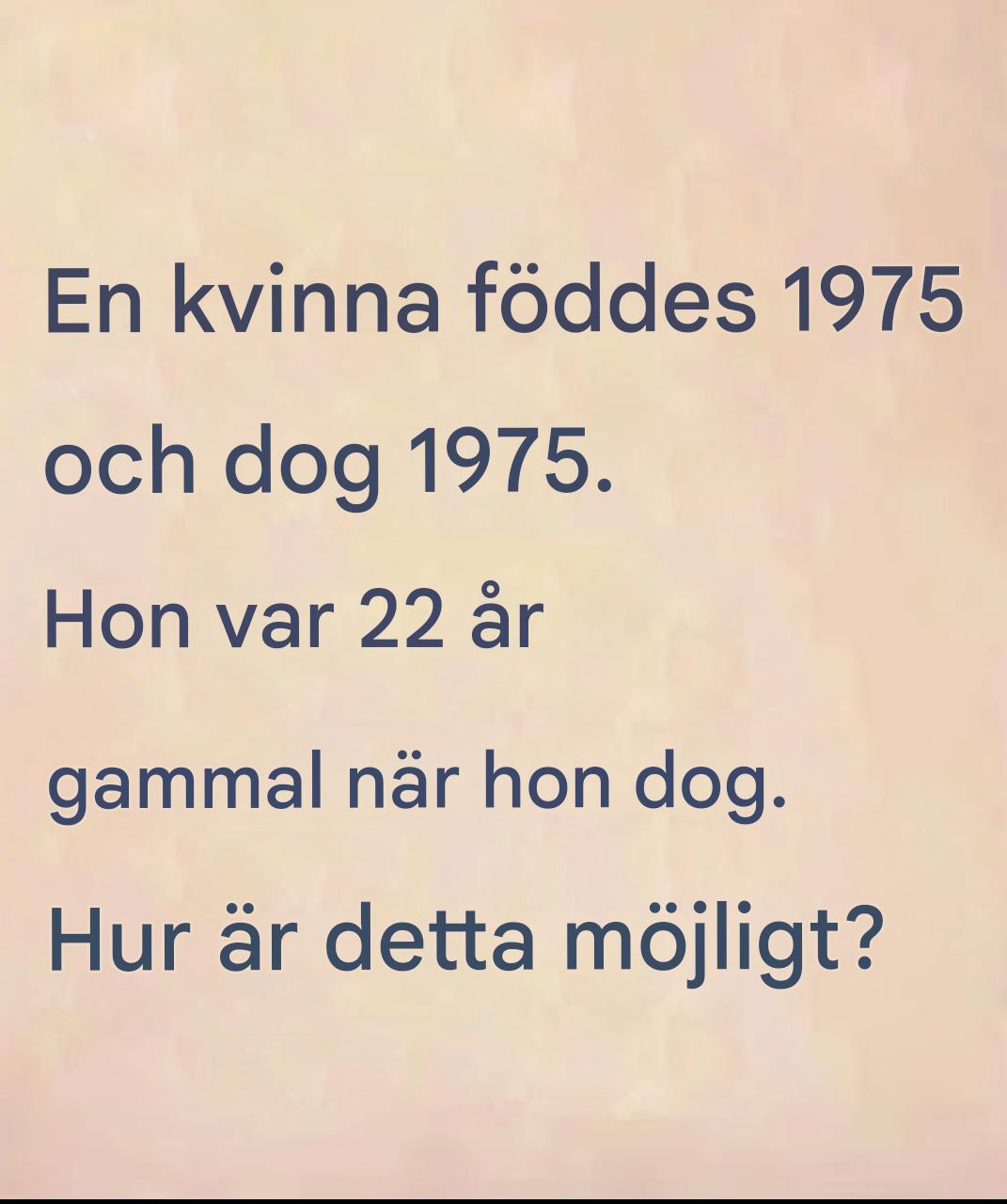 Tänk dig: du snubblar över den här märkliga meningen när du skrollar igenom ditt nyhetsflöde. "En kvinna föddes 1975 och dog 1975. Hon var 22 år gammal." Den får dig att stanna upp. Obegripligt? Förbryllande? Det måste finnas en hake någonstans… Men var? Håll i dig, för den här gåtan utmanar vår logik, våra automatiska reaktioner och kräver en touch av fantasi. Tänk om nyckeln var just att inte tänka som vi brukar?