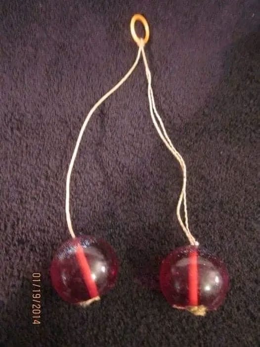 På bilden ser vi två färgade plastkulor, sammanbundna med ett snöre och en liten ring upptill. En enkel konstruktion – men bakom denna enkelhet döljer sig en av 1970-talets mest minnesvärda och kontroversiella leksaker: Clackers.