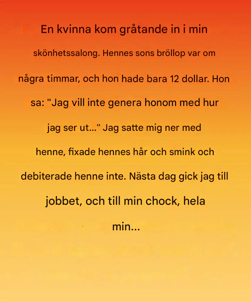 Medan jag lockade hennes silverfärgade hår och försiktigt duttade färg på hennes trötta ansikte, talade hon om sin avlidne make, mannen som alltid hade påmint henne om hur vacker hon var. När jag äntligen vände henne mot spegeln log hon – ett litet, strålande leende som tycktes lysa upp hela rummet – och viskade: "Jag ser ut som mitt gamla jag igen."