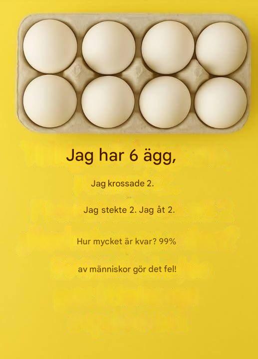 "Jag har 6 ägg. Jag krossade 2. Jag stekte 2. Jag åt 2. Hur många ägg har jag kvar?"
