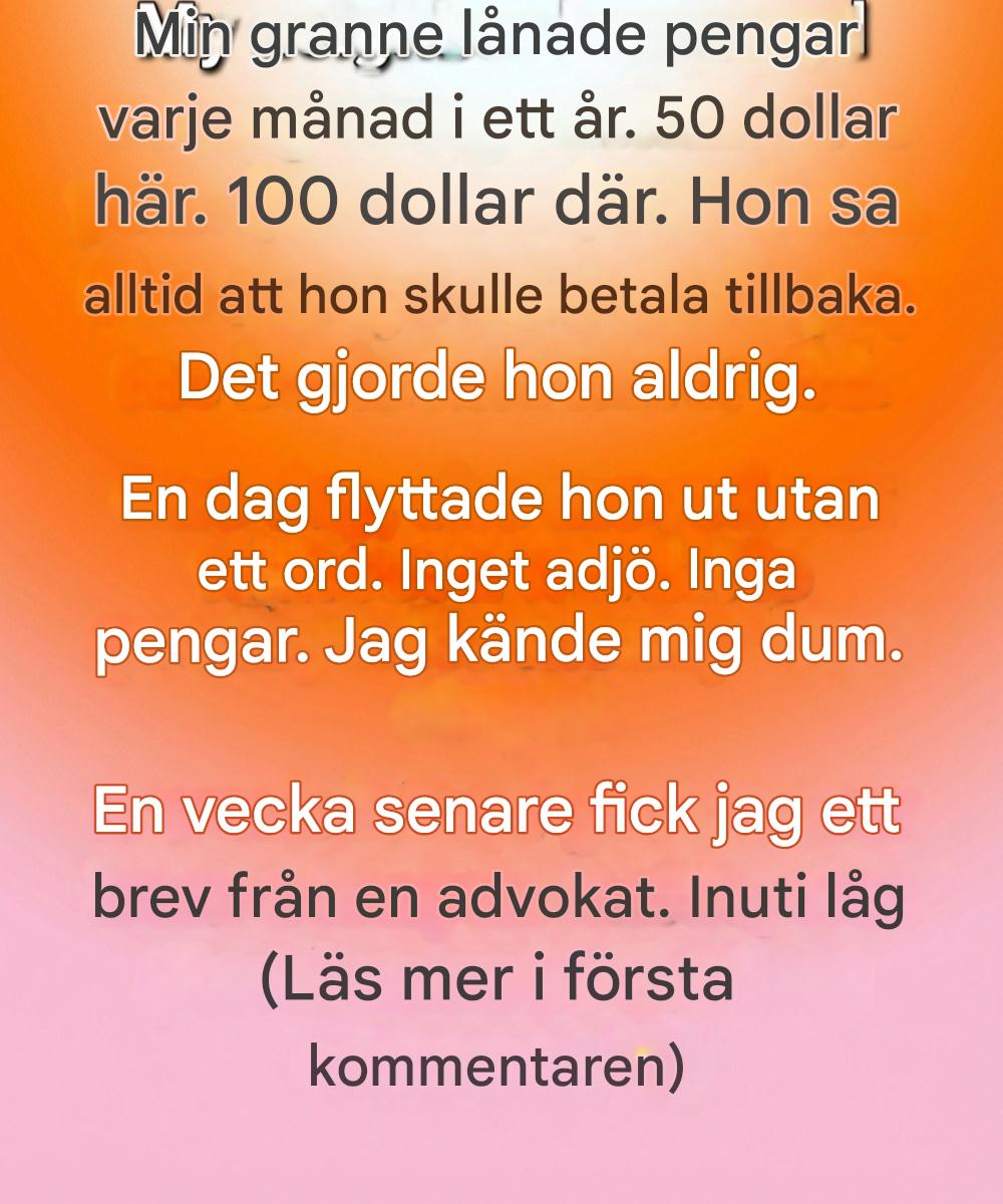 Lena hade alltid en förklaring – nedlagda arbetspass, oväntade läkarbesök, nödsituationer som verkade komma i rad. Jag började känna mig illa till mods, till och med dum, för att jag fortsatte att lita på henne. Så en morgon såg jag en flyttbil parkerad utanför hennes lägenhet. Vid dagens slut var hennes lägenhet tom. Inget avsked, inget meddelande och inga tecken på att hon tänkte betala av det hon var skyldig. När jag stod i hallen och stirrade på hennes stängda dörr kände jag mig mer generad än arg. Det var inte bara pengarna som gjorde ont – det var insikten att jag kanske hade blivit utnyttjad.