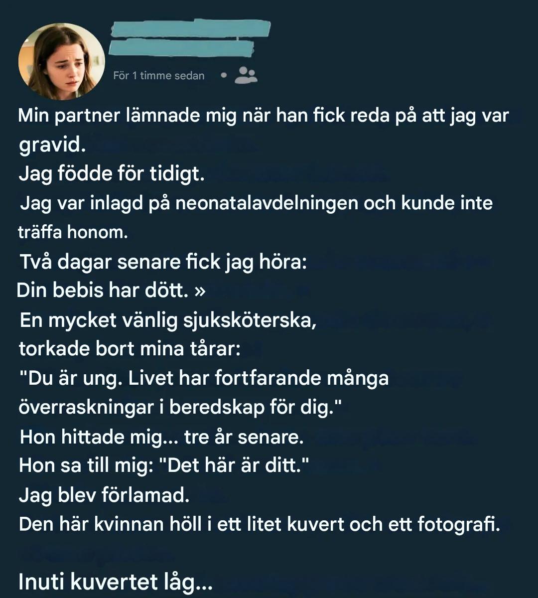 Två dagar senare kom nyheten, kall och oåterkallelig. Världen stannade. Inget skrikande, ingen scen. Bara detta enorma, obeskrivliga tomrum. Hur kan man sörja någon man aldrig fick hålla? Det var då en tyst närvaro förändrade något. En sjuksköterska satte sig bredvid henne. Inget dramatiskt. Bara en mjuk röst, långsamma gester och den viskade frasen, som ett bräckligt löfte: "Du är ung. Livet har fortfarande planer för dig." I det ögonblicket verkade dessa ord omöjliga att tro på.