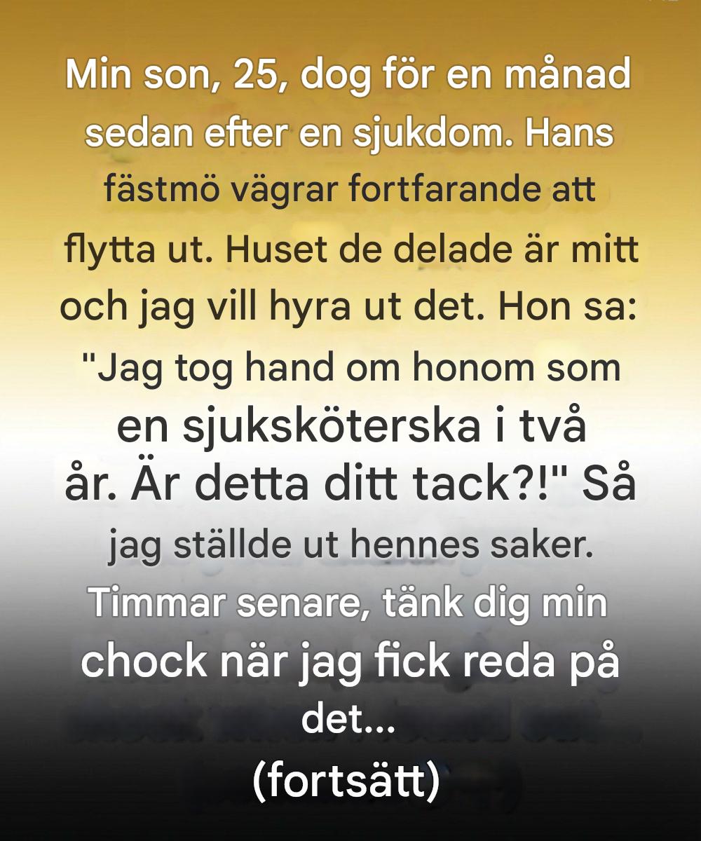 Sorgen urholkade mig på sätt jag inte kände igen mig själv. Mitt i dimman bodde hans fästmö fortfarande i huset de hade delat – ett hus som lagligen tillhörde mig. Jag ville hyra ut det, delvis av ekonomiska skäl, men mest för att det kändes outhärdligt att gå förbi hans tomma rum. När jag sa till henne att hon behövde gå tittade hon på mig med röda, sömnlösa ögon och sa: ”Jag tog hand om honom i två år som en sjuksköterska. Är det verkligen din tacksamhet?” Jag svarade inte. Jag ställde hennes tillhörigheter utomhus istället. Just då trodde jag att jag skyddade mig själv. Jag hade ingen aning om att min sorg förblindade mig för allt hon i tysthet hade gjort.