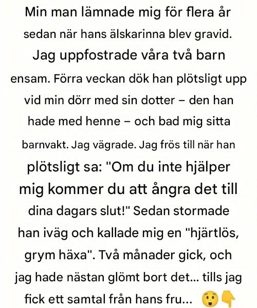 Tiden gjorde sitt tysta arbete. Mina barn blev starkare. Det gjorde jag också. Smärtan blev något jag förstod snarare än något som styrde mig. Jag trodde att det kapitlet i mitt liv var ordentligt avslutat.