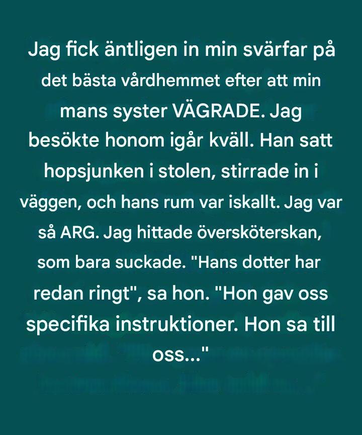 Det var jag som äntligen lyckades få min svärfar till ett förstklassigt vårdhem – efter att min avlidne mans syster blankt vägrade att hjälpa till.