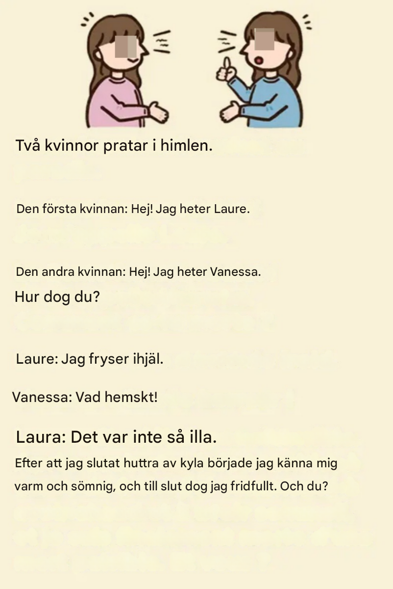 Första kvinnan: "Synd att du inte kollade frysen... vi skulle båda fortfarande vara vid liv."