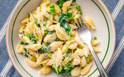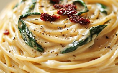 Krämig spaghetti med spenat och soltorkade tomater