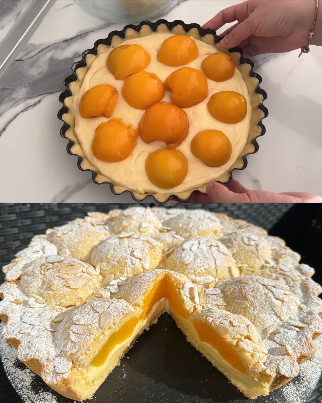 Denna persika- och citronkrämtårta kombinerar en len, smörig skorpa, krämig lemon curd och söta persikor i sirap. Toppad med mandelflagor och ett strö florsocker är det en perfekt dessert för alla tillfällen.