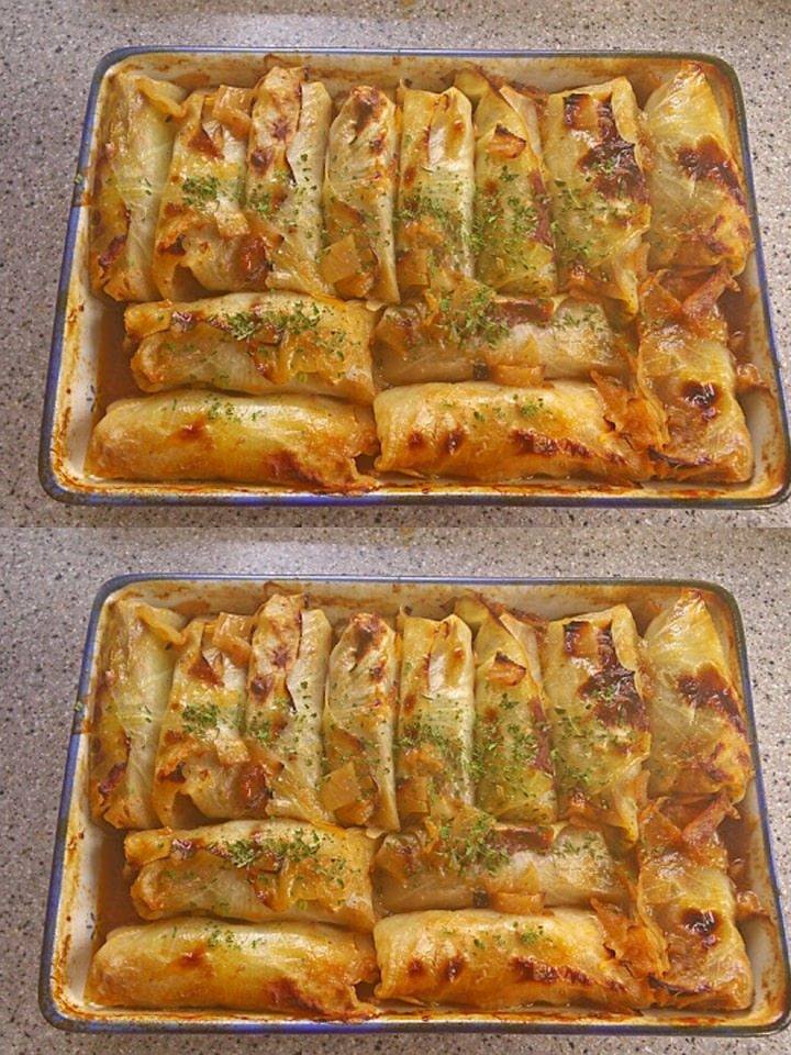 Skär bort kålstjälken med en vass kniv och lossa försiktigt kålbladen. Koka bladen i saltat vatten i cirka 10 minuter, tills de är mjuka. Låt rinna av.